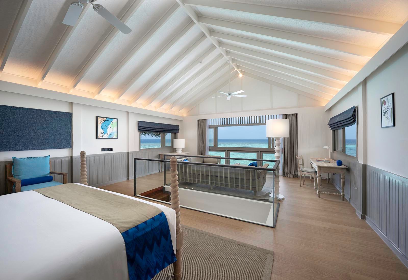 (Max 3 Adults) (234 Sqm) A full-on family party palace, this ocean-top villa has it all. You’ll sleep like a dream in the two bedrooms with adjoining bathrooms – both huge and with sea views. Share tea and hot chocolate on the deck. Then kick back on the sun-loungers as the kids have a splash in your deck-topped pool. Take your pick of two ways into the ocean. Opt for the serene movie-star way via the steps straight from your deck – or the go-wild fun way via a slide. This is one trip the family will never forget.