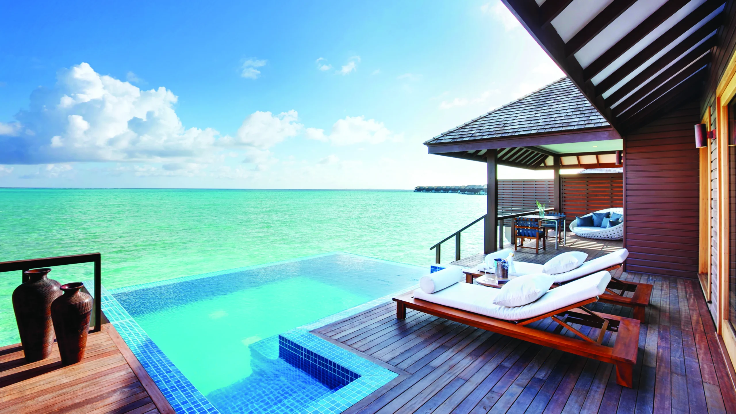 (Max 3 Adults) (190 Sqm) Perched on wooden stilts over the mesmerizing turquoise lagoon, our Deluxe Water Villas provide the perfect backdrop for an ultimate romantic escape. The spacious contemporary-style bedroom boasts floor-to-ceiling windows leading to a terrace featuring an inviting infinity pool and sun loungers, creating a haven for relaxation with endless views of the serene ocean.