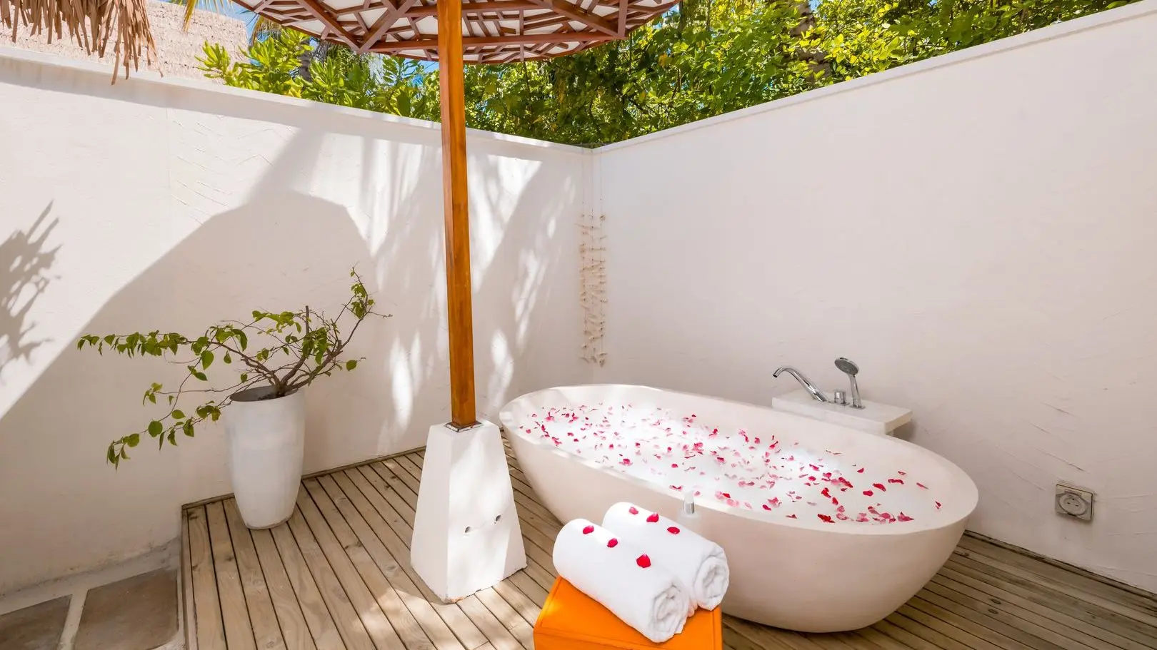 (Max 3 Adults) (82 Sqm) Our intimate beach villas in the Maldives are infused with warm earthy tones and fresh hues to recreate the balmy island vibe. Experience barefoot luxury in our stunning villas with high-slanted ceilings, a private outdoor deck amidst tropical foliage, spacious bathrooms with handcrafted bathtubs and a monsoon shower.