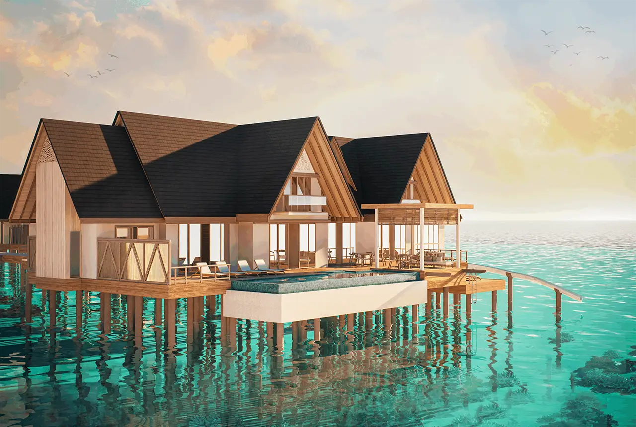 (Max 8 Adults) (950 Sqm) The ultimate overwater luxury, this Over Water Presidential Suite with Slide features four bedrooms, a large lap pool, and a private slide into the ocean.