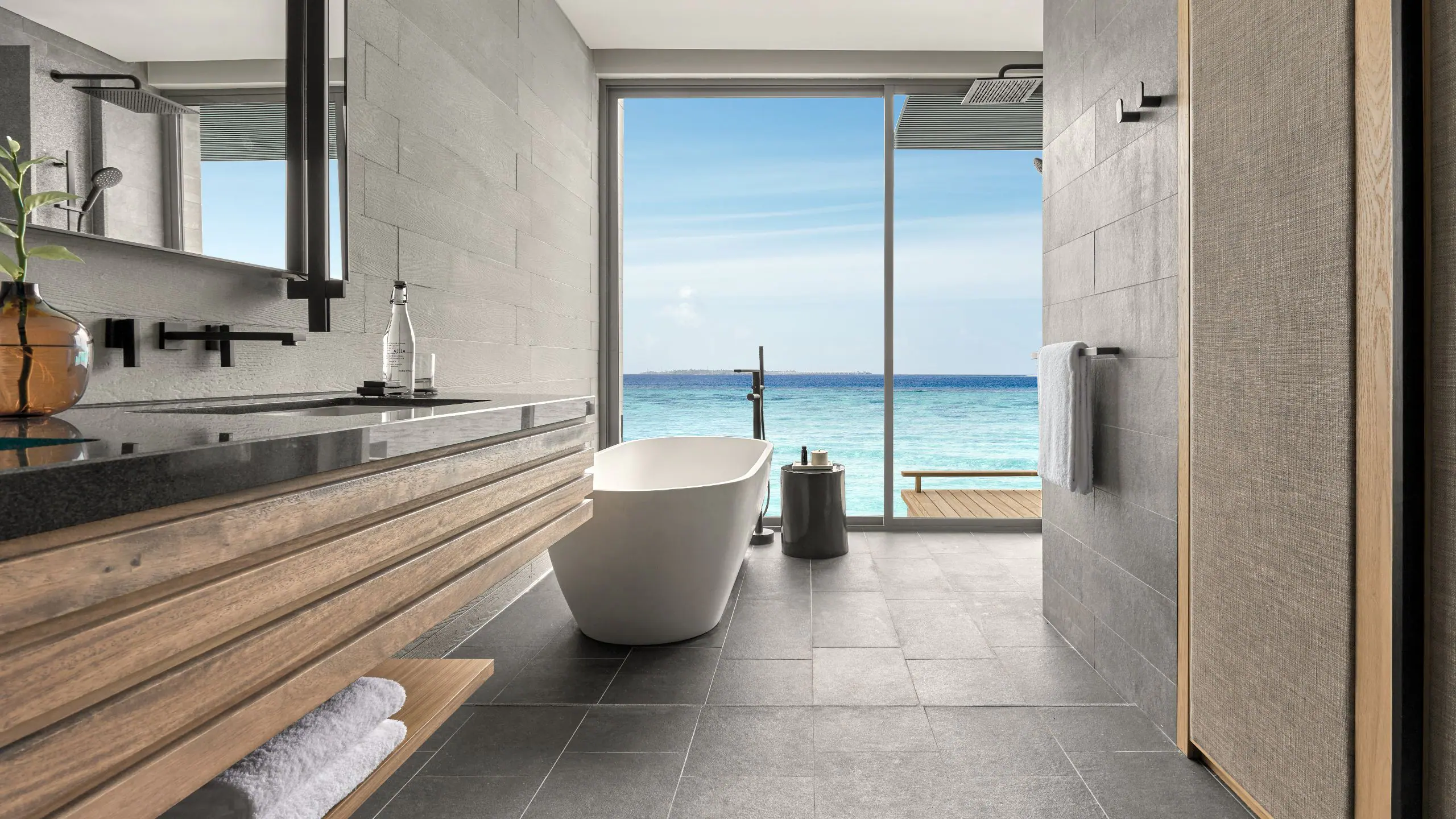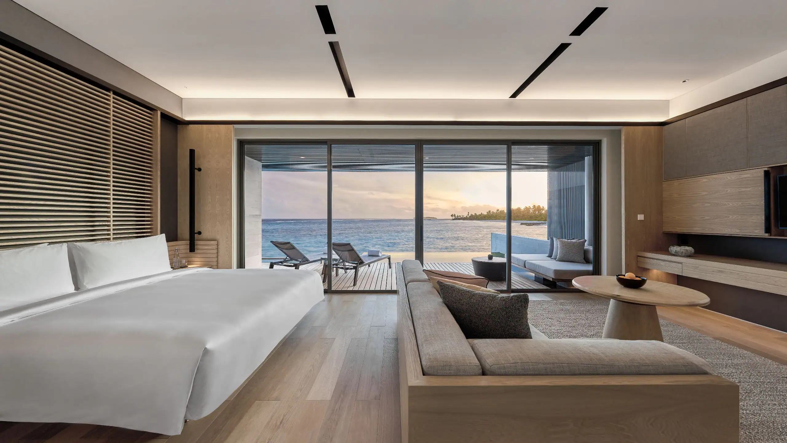 (125 Sqm) Stretch out in the sun and dream under the stars in this intimate overwater sanctuary, designed to indulge you in elegant comfort and nature’s immaculate beauty. The villa features an open-concept bedroom and living room connected by floor-to-ceiling sliding glass doors to a private pool and sun deck.
