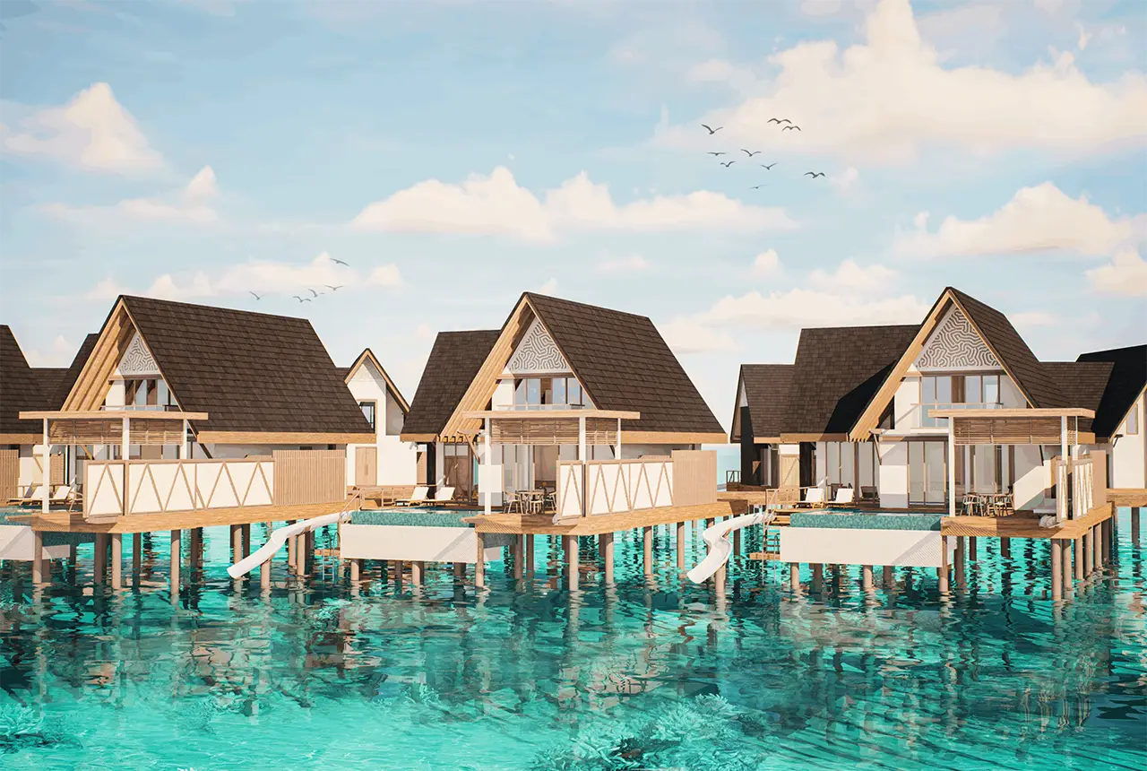 (Max 3 Adults) (372 Sqm) Designed for ultimate indulgence, this Water Pool Suite with Slide features one bedroom, a separate living area, a private plunge pool, and a thrilling waterslide – an extraordinary choice for a luxurious overwater retreat.